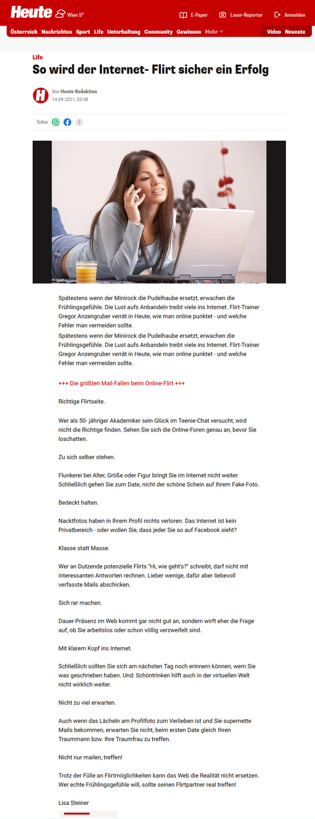 am Arbeitsplatz [mehr...] Der bekannte Flirttrainer im Interview mit der Tageszeitung Heute |