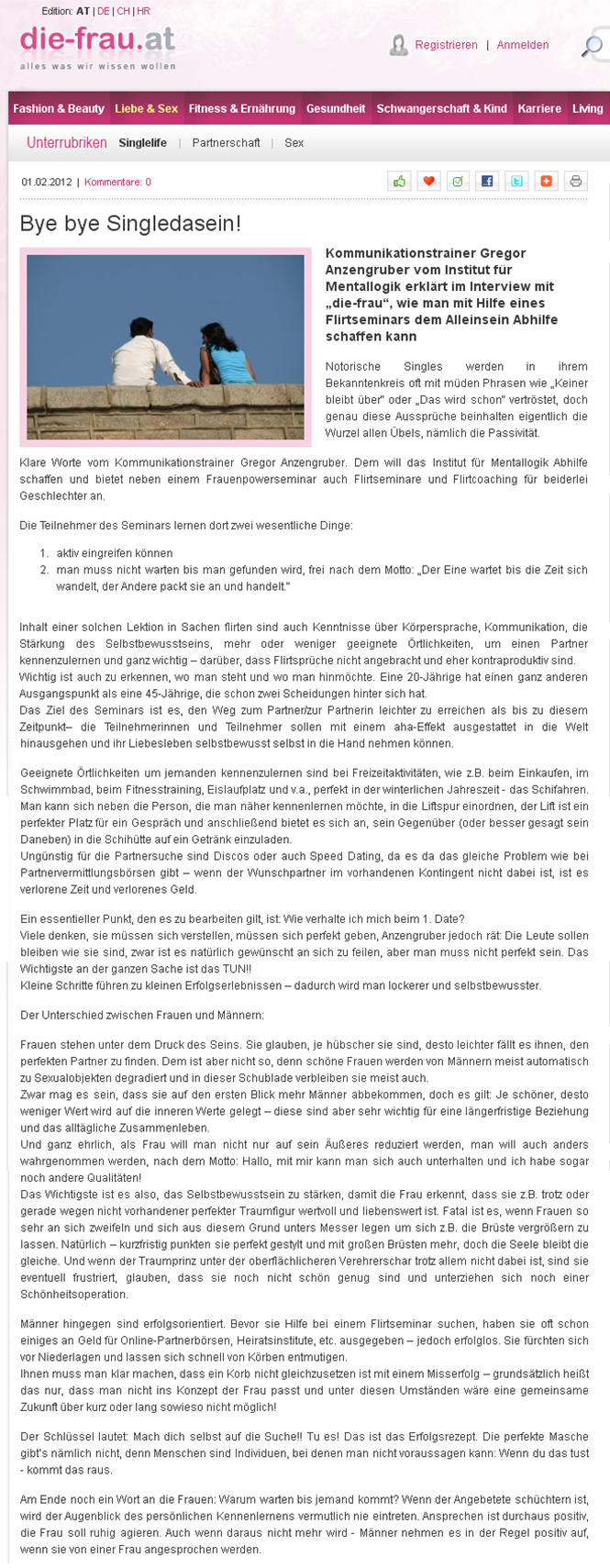 bye Singledasein..." [mehr...] Der Experte im Interview mit „die-frau“, wie man mit Hilfe eines Flirtseminars dem Alleinsein entfliehen kann |